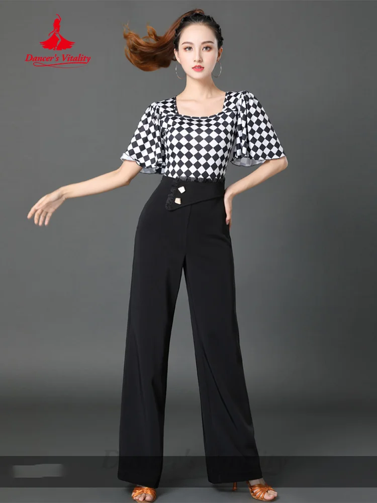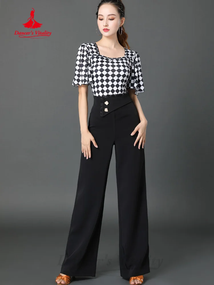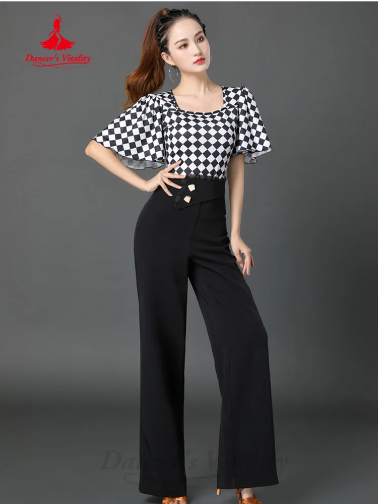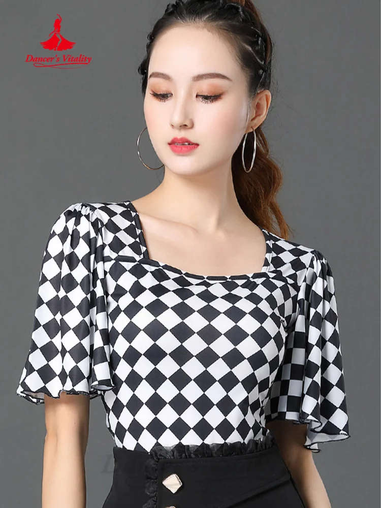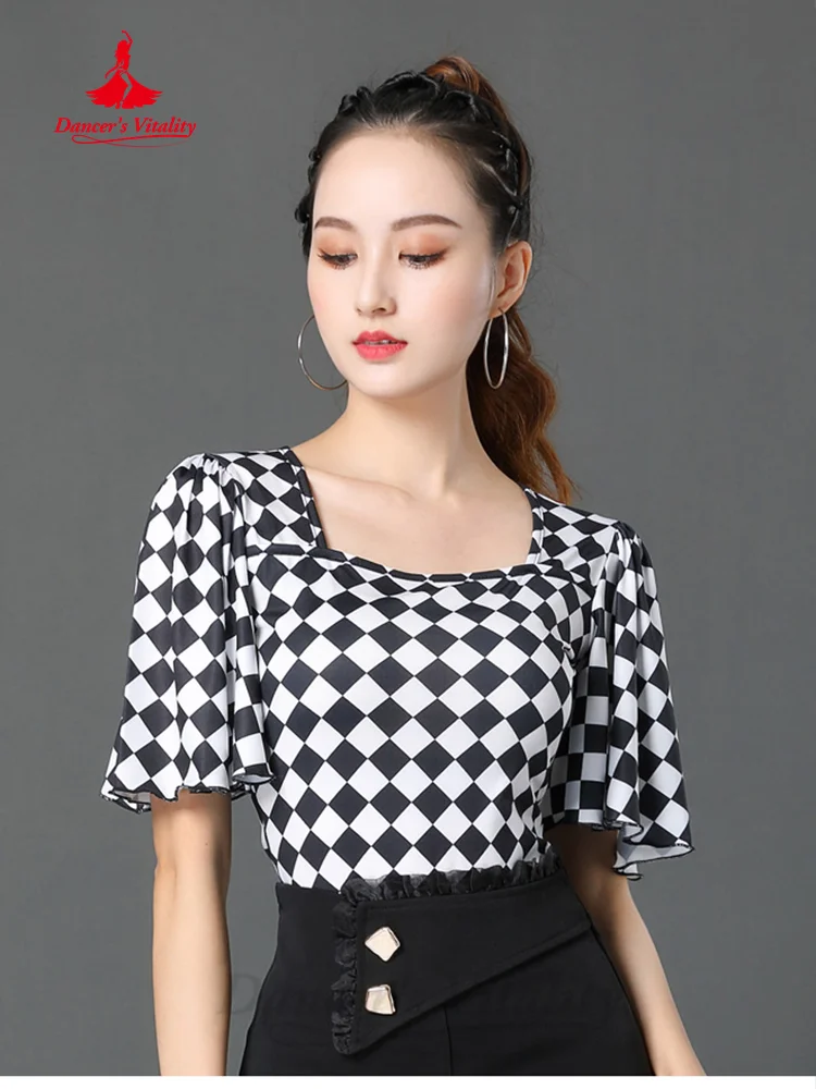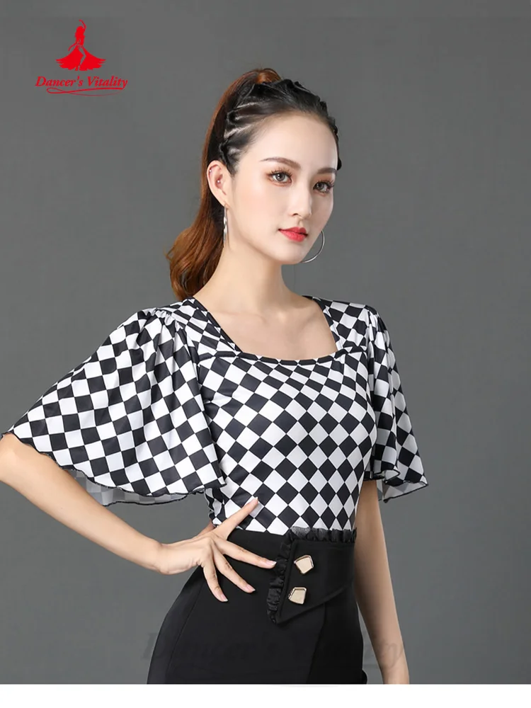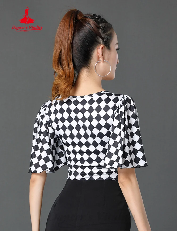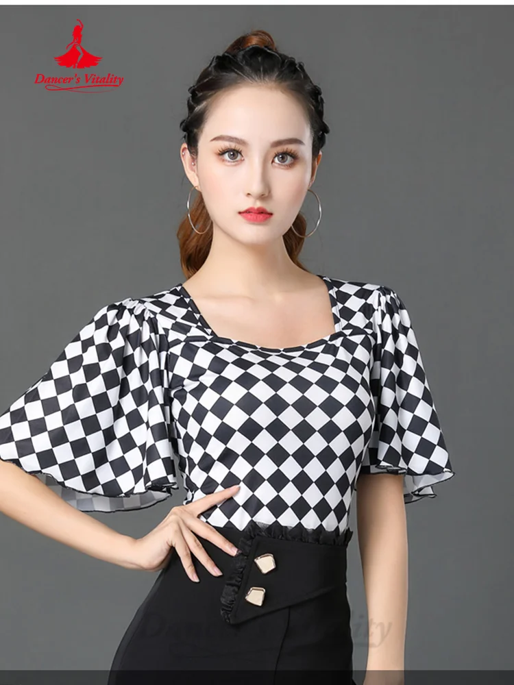 Latin Dance Practice Costumes Customized Horn Sleeves Half Sleeves Black and White Plaid Top Tango Chacha Performance Clothing