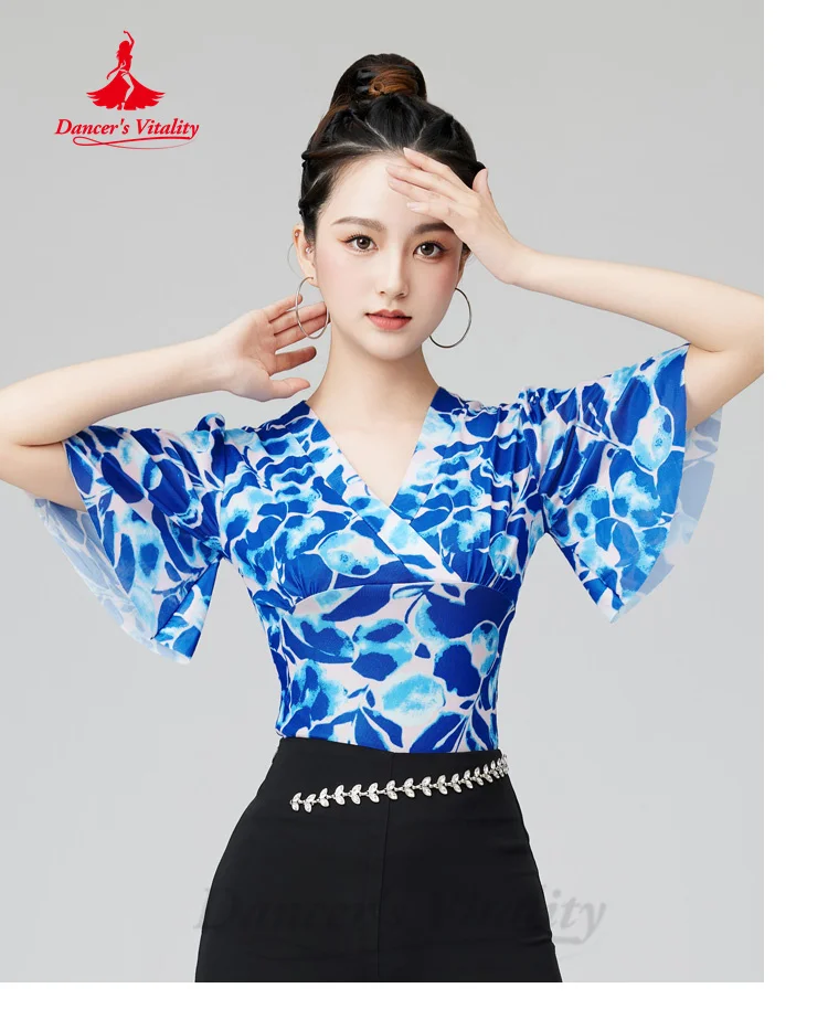 Latin Dance Costume Customization V-neck Trumpet Sleeve Top for Adult Women Tango Cha Cha Samba Professional Practice Clothes
