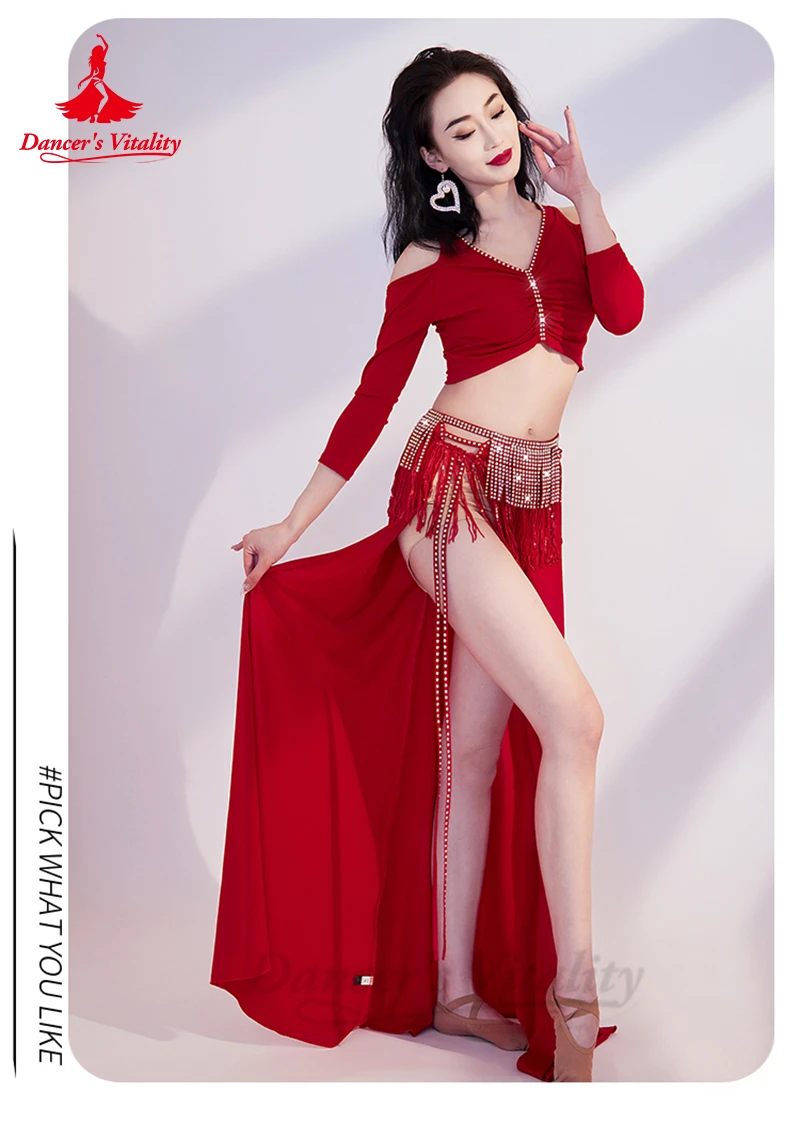 Belly Dance Costume Set for Women Long Sleeves Top+tassel Long Skirt 2pcs Stones Training Suit Oriental Belly Dancing Outfit
