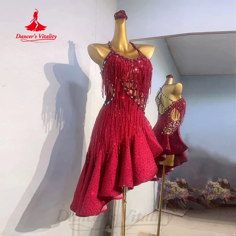 Latin Dance Performance Costume Customized Luxury Full Diamond Tassel Dress Adult Children Tango Rumba Samba Competition Dresses