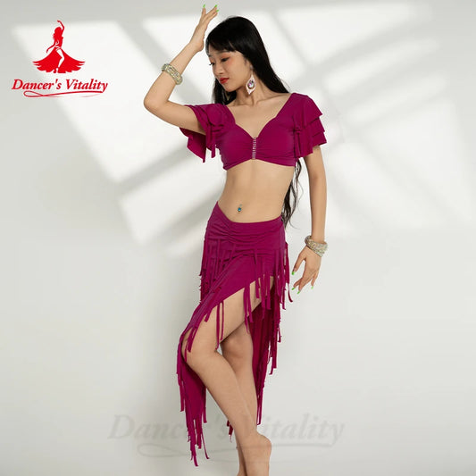 Belly Dance Costume Suit for Women Cotton Top+tassel Skirt 2pcs Oriental Belly Dancing Performance Professional Costumes Set