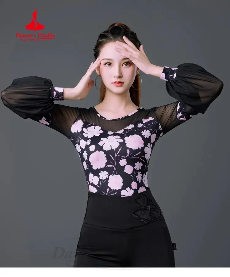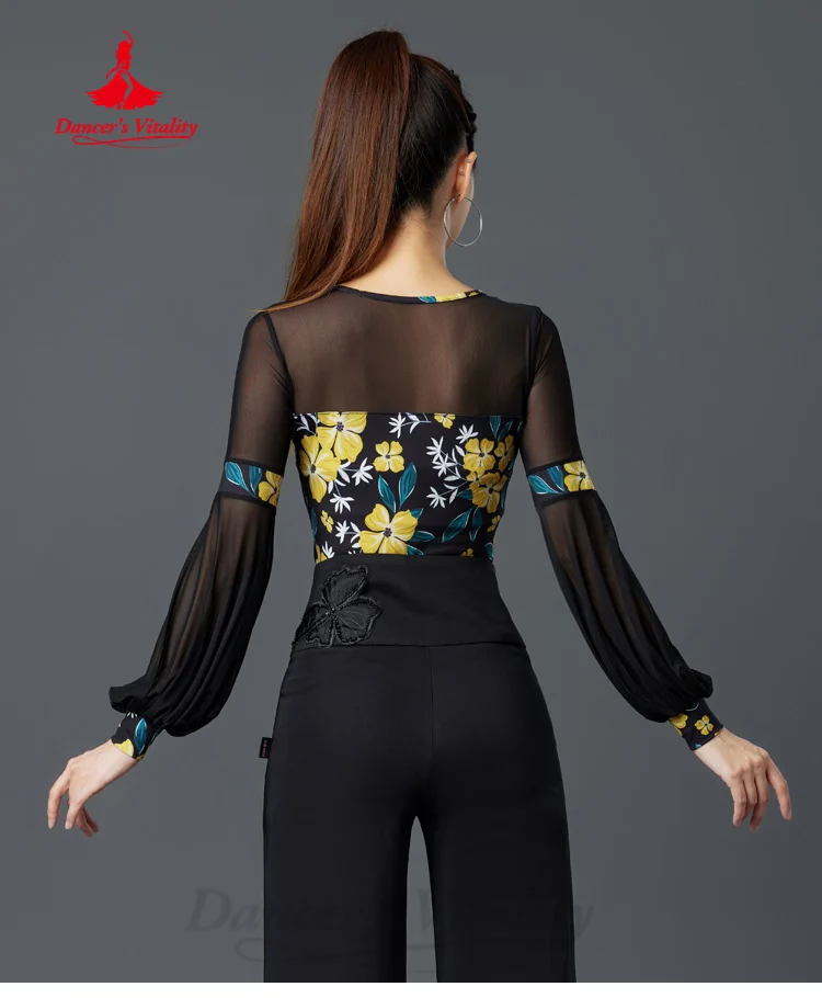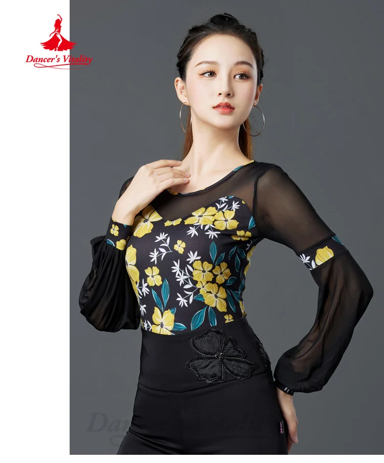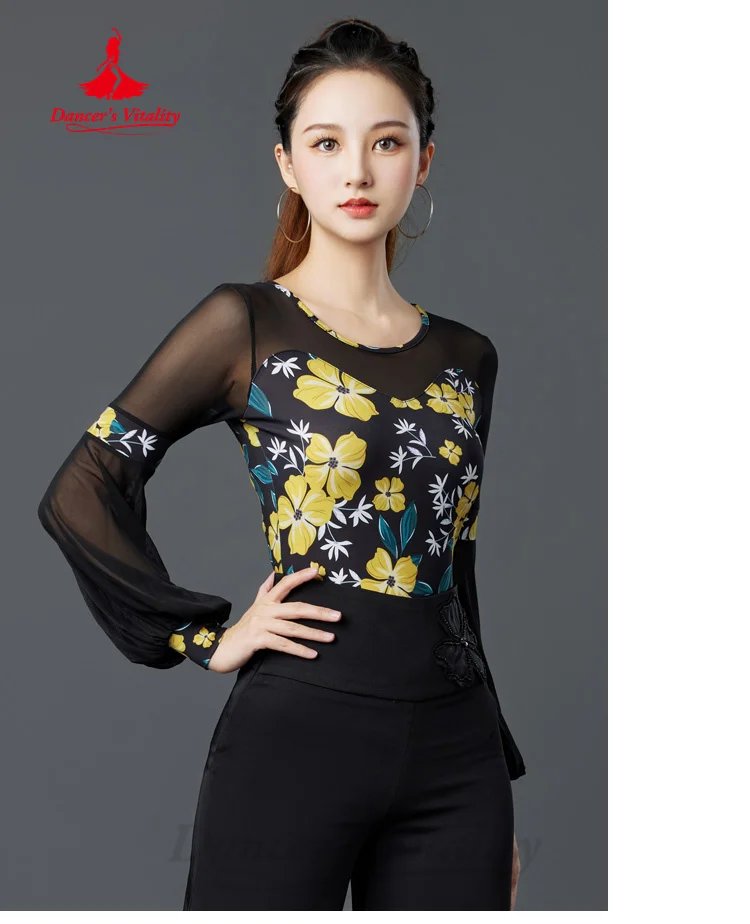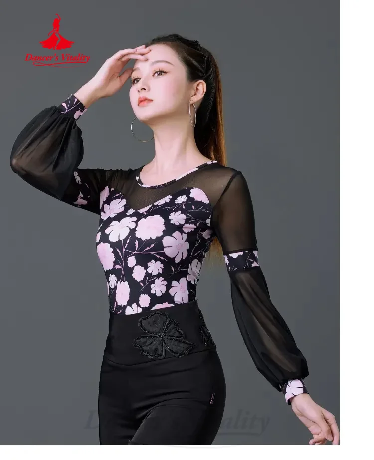 Latin Dancing Modern Dance Costume Women's Customized High Grade Printed Long Sleeved Top Tango Chacha Samba Training Clothes