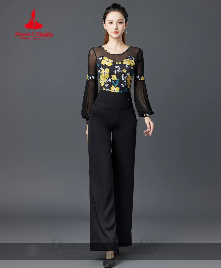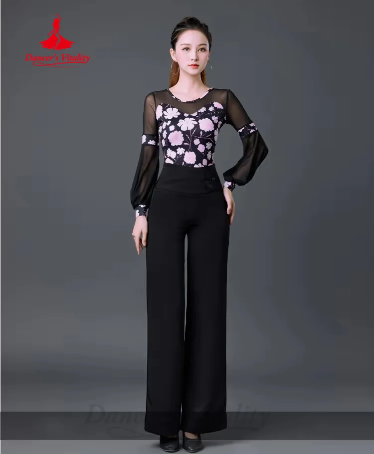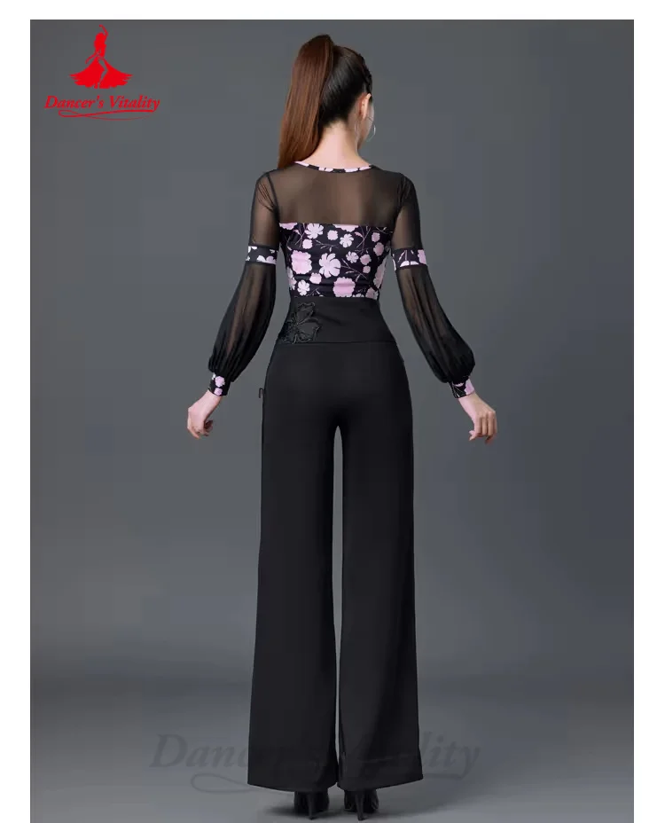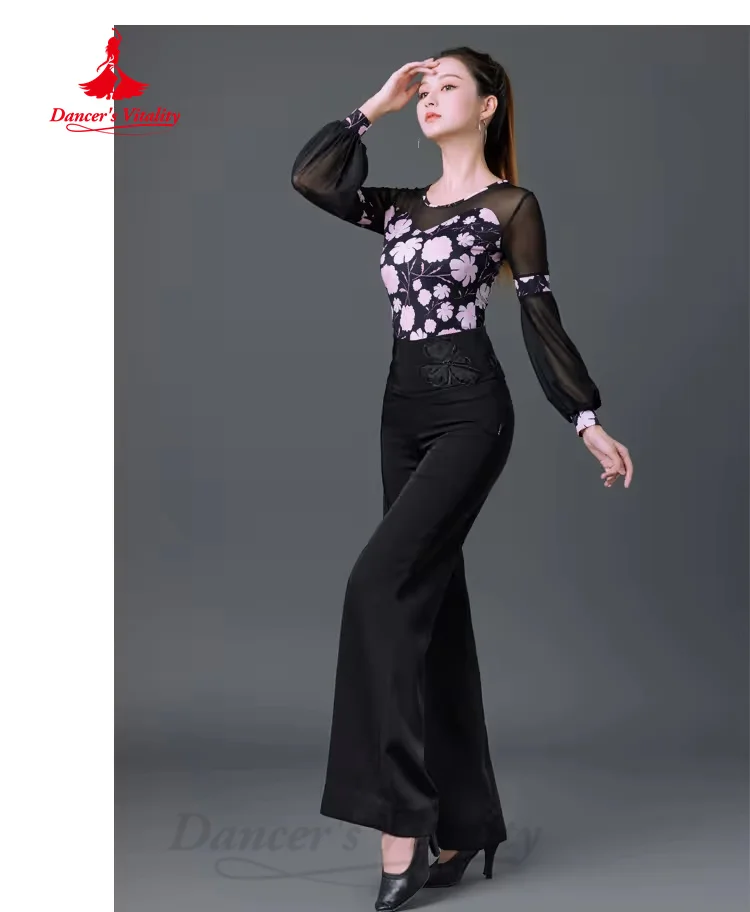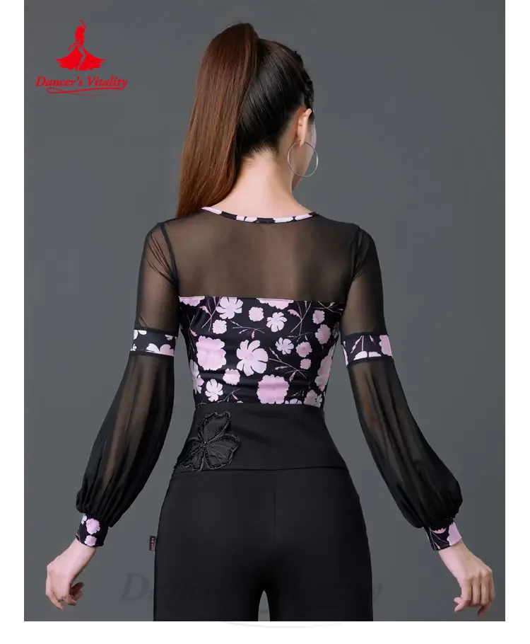 Latin Dancing Modern Dance Costume Women's Customized High Grade Printed Long Sleeved Top Tango Chacha Samba Training Clothes