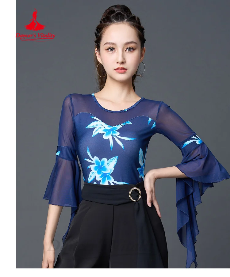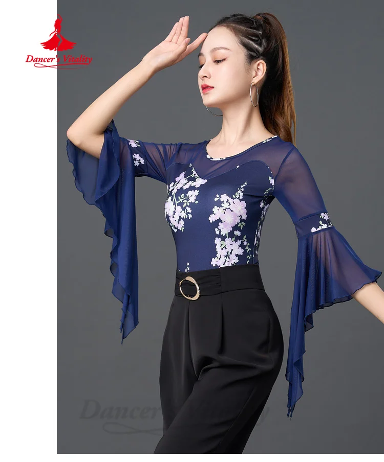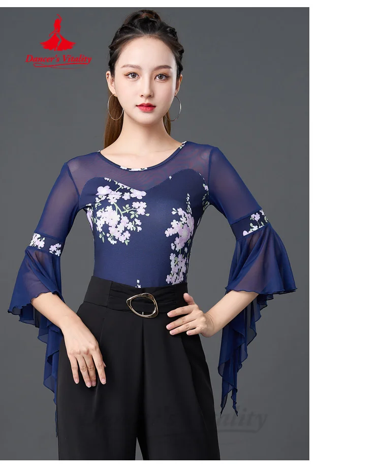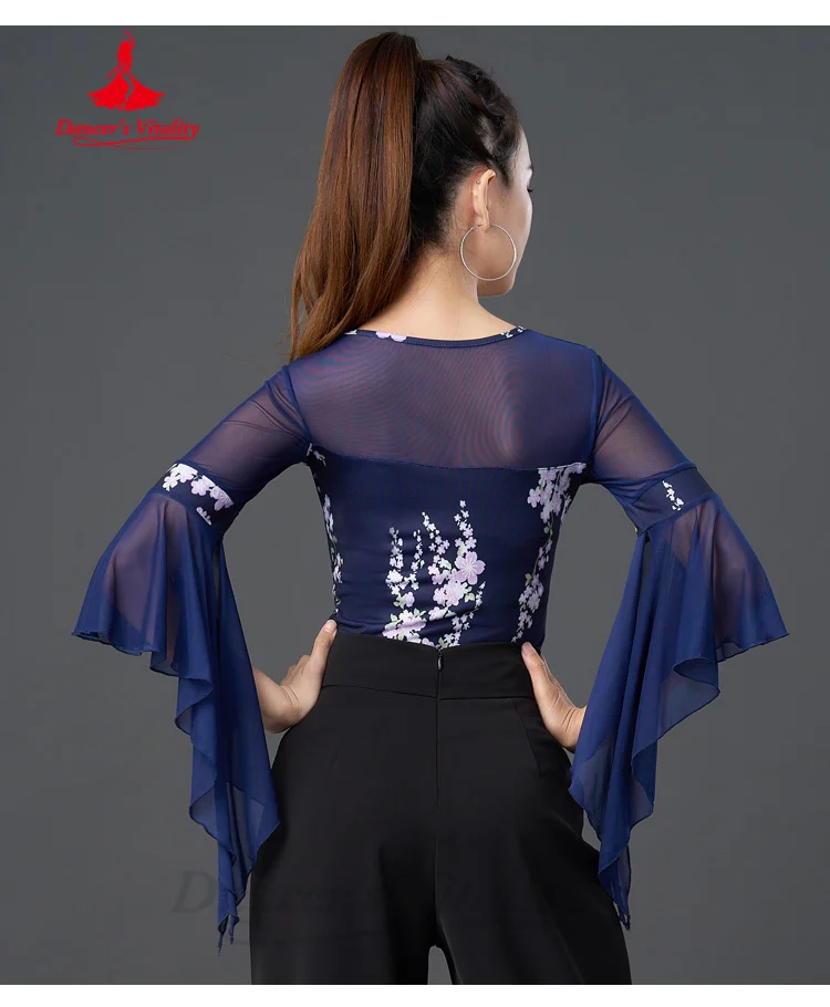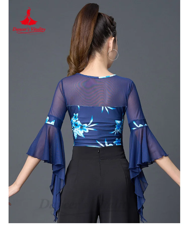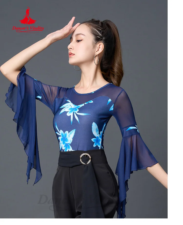 Latin Dance Practice Clothing Women's Customized High End Printed Flare Sleeve Top Chacha Rumba Samba Performance Costume