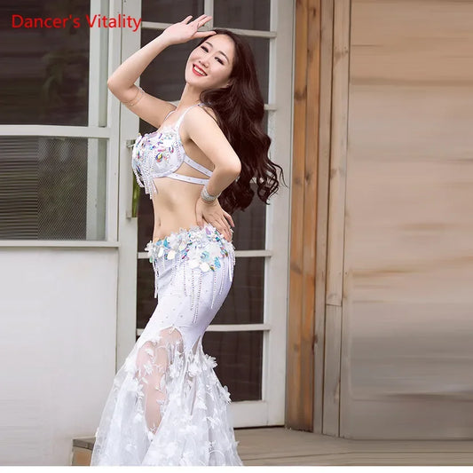 Luxury Diamond Oriental Dance Outfit Women Piece 2 Performance Belly Dance Performance Bra+long Skirt Sexy Red White