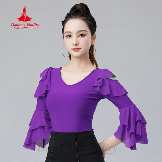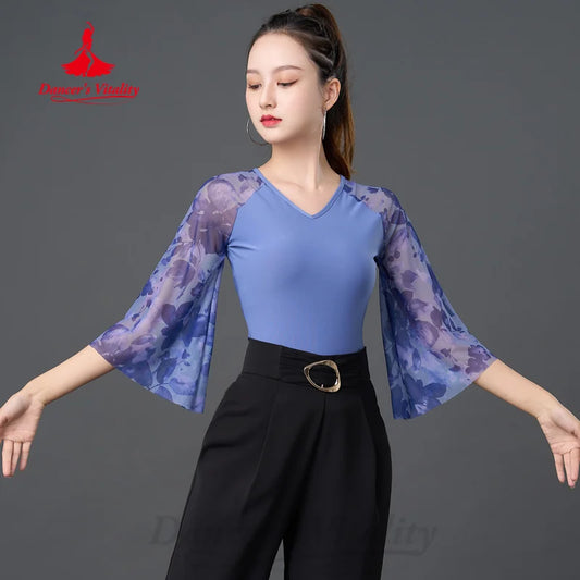 Latin Dancing Social Dance Practice Clothes Customized Printed Flare Sleeves Top Women's Tango Chacha Samba Performance Costume