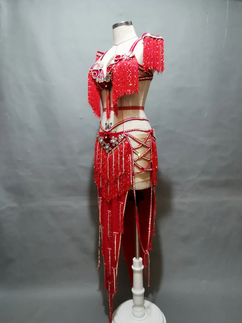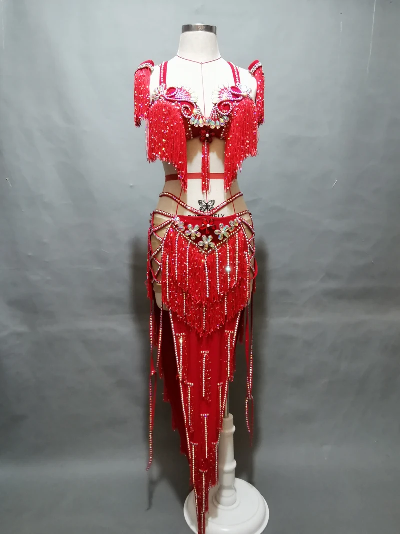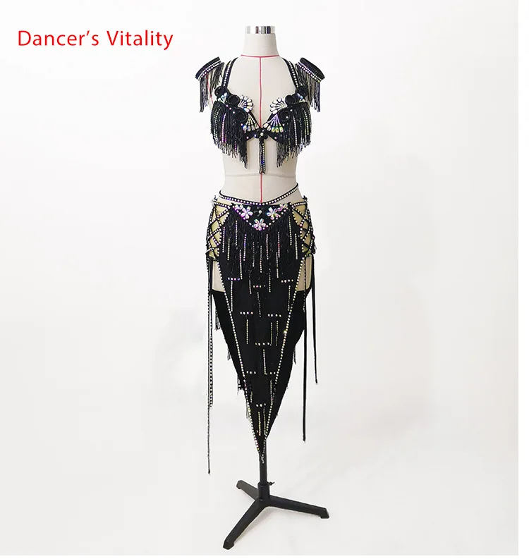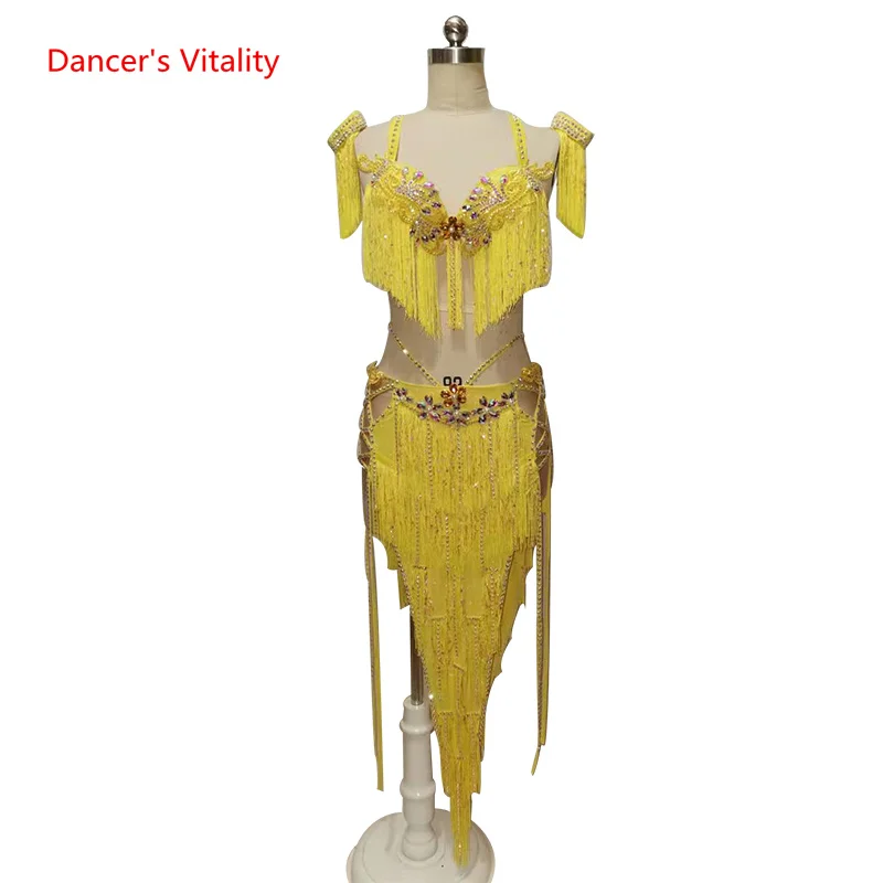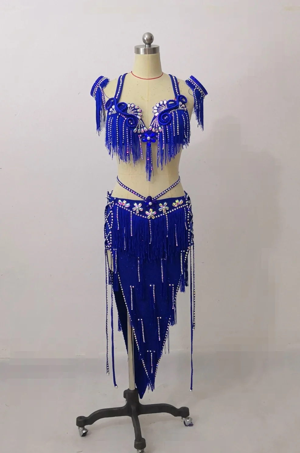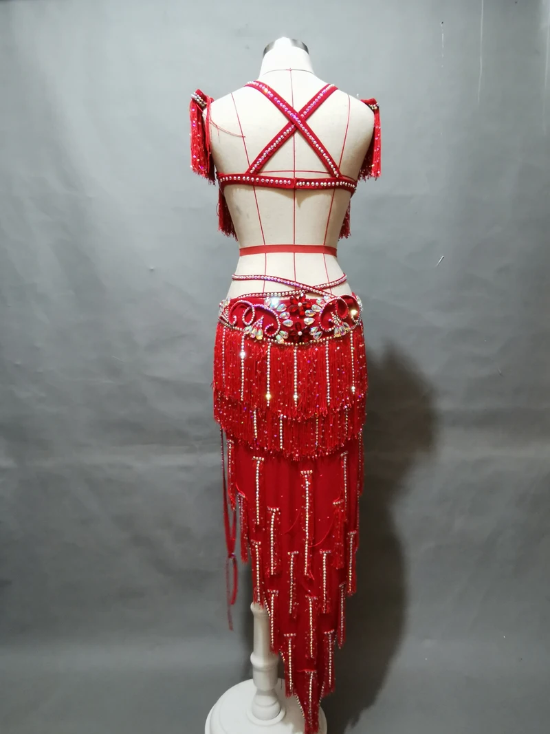 Belly Dance Competition Outfits Customized Bra Diamond Tassel Skirt Set Oriental Indian Drum Dancing Stage Performance Costume