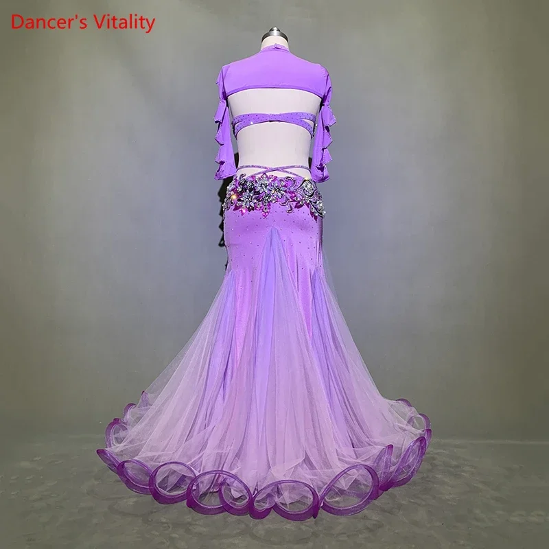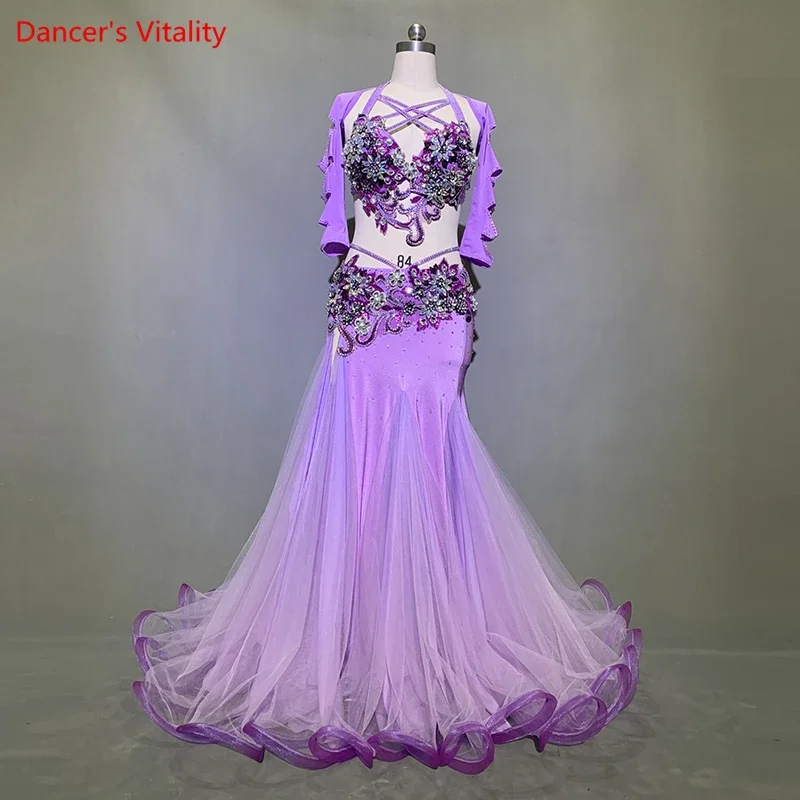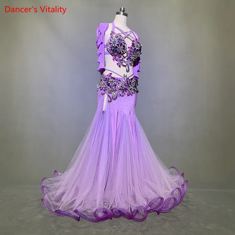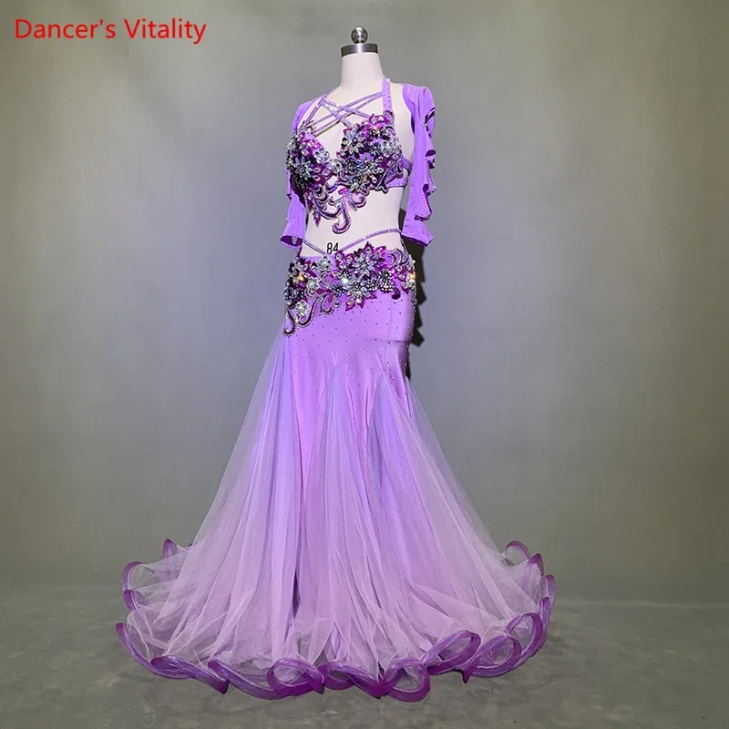 Customized Belly Dance Rhinestone Bra Mesh Patchwork Skirt Set Women Oriental Indian Drum Dance Group Competition Stage Costume