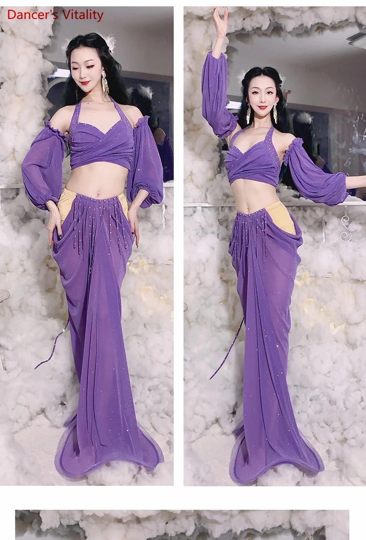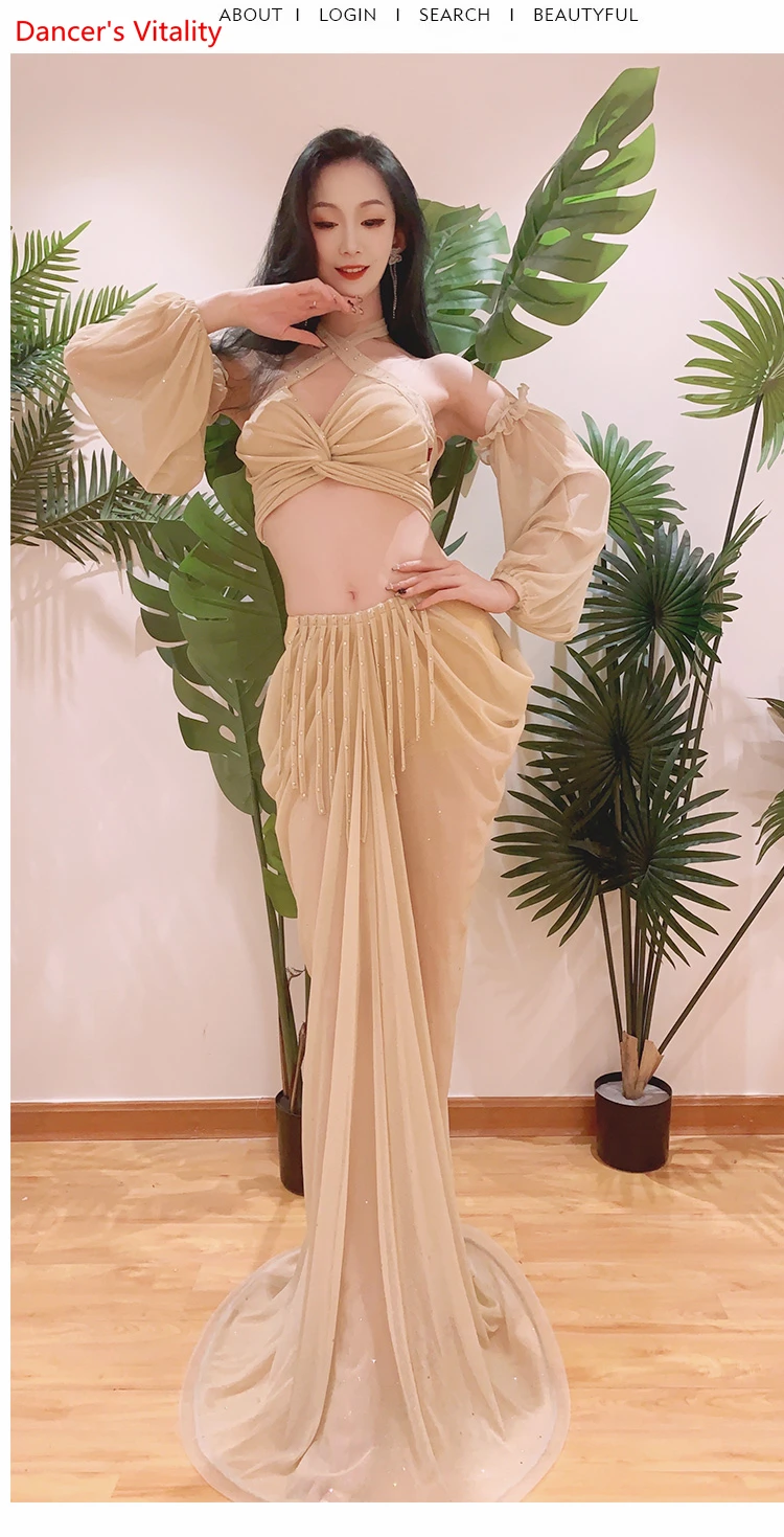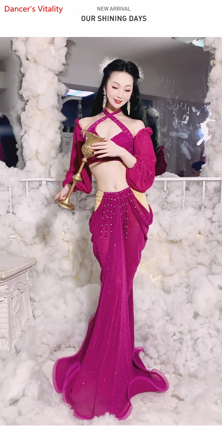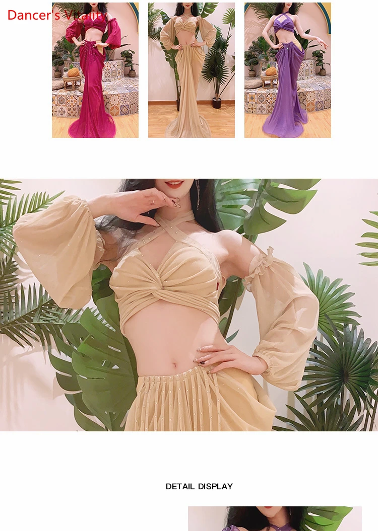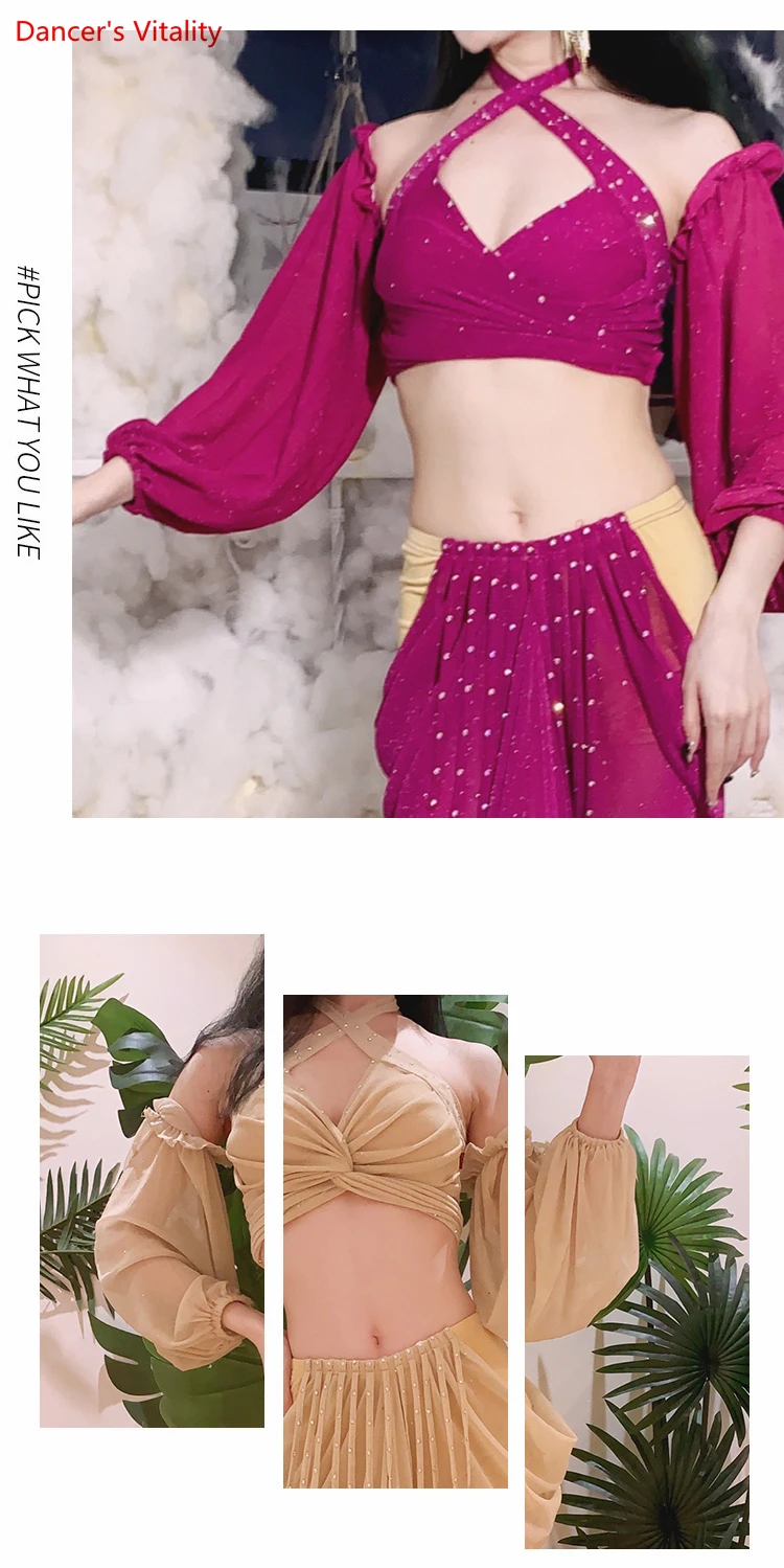 Belly Dance Practice Clothes Female Oriental Dance Top+sleeves+long Skirt 3pcs for Women Belly Dancing Outfit Bellydance Set
