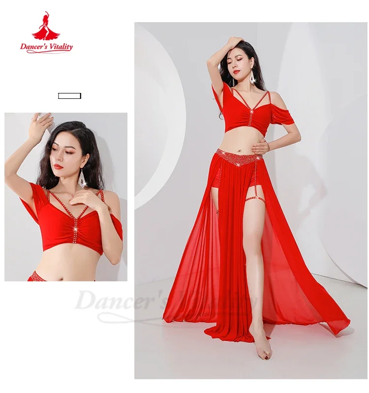 Belly Dance Professional Suit for Women Mesh Short Sleeves Top+sexy Split Long Skirt 2pcs Girl's Oriental Belly Dancing Suit